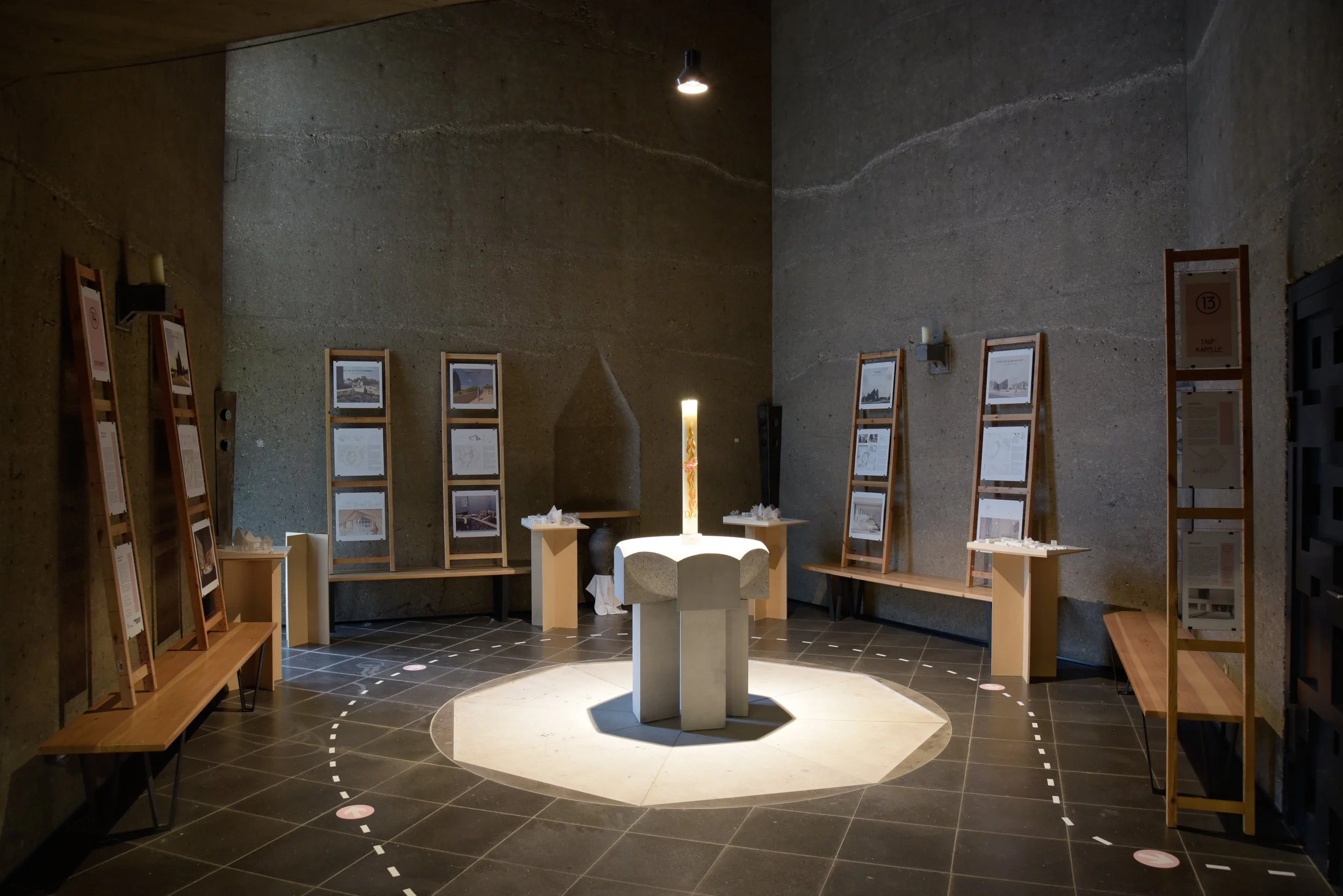 Nach dem Entwurf zur Umnutzung der Kirche St. Hubertus haben wir im Rahmen des Projekts „Vorstadtikone“ eine Ausstellung innerhalb und um die Kirche realisiert. Diese Ausstellung zielt darauf ab, das Bewusstsein für dieses weniger bekannte Meisterwerk zu schärfen und die Wertschätzung für seinen ausdrucksstarken Außenbereich und das atmosphärische Innenleben zu fördern. Durch verschiedene Stationen innerhalb der Kirche heben wir bemerkenswerte Merkmale des Gebäudes hervor.