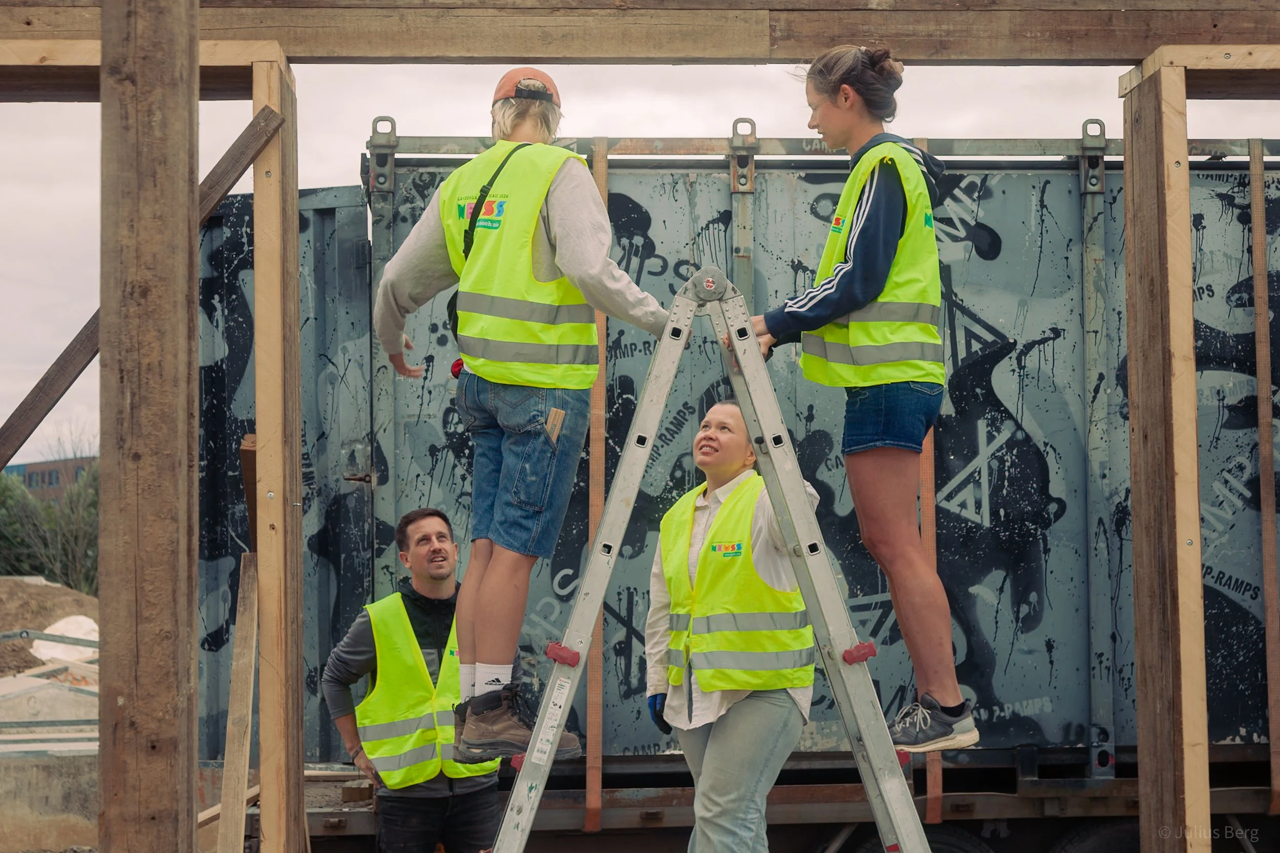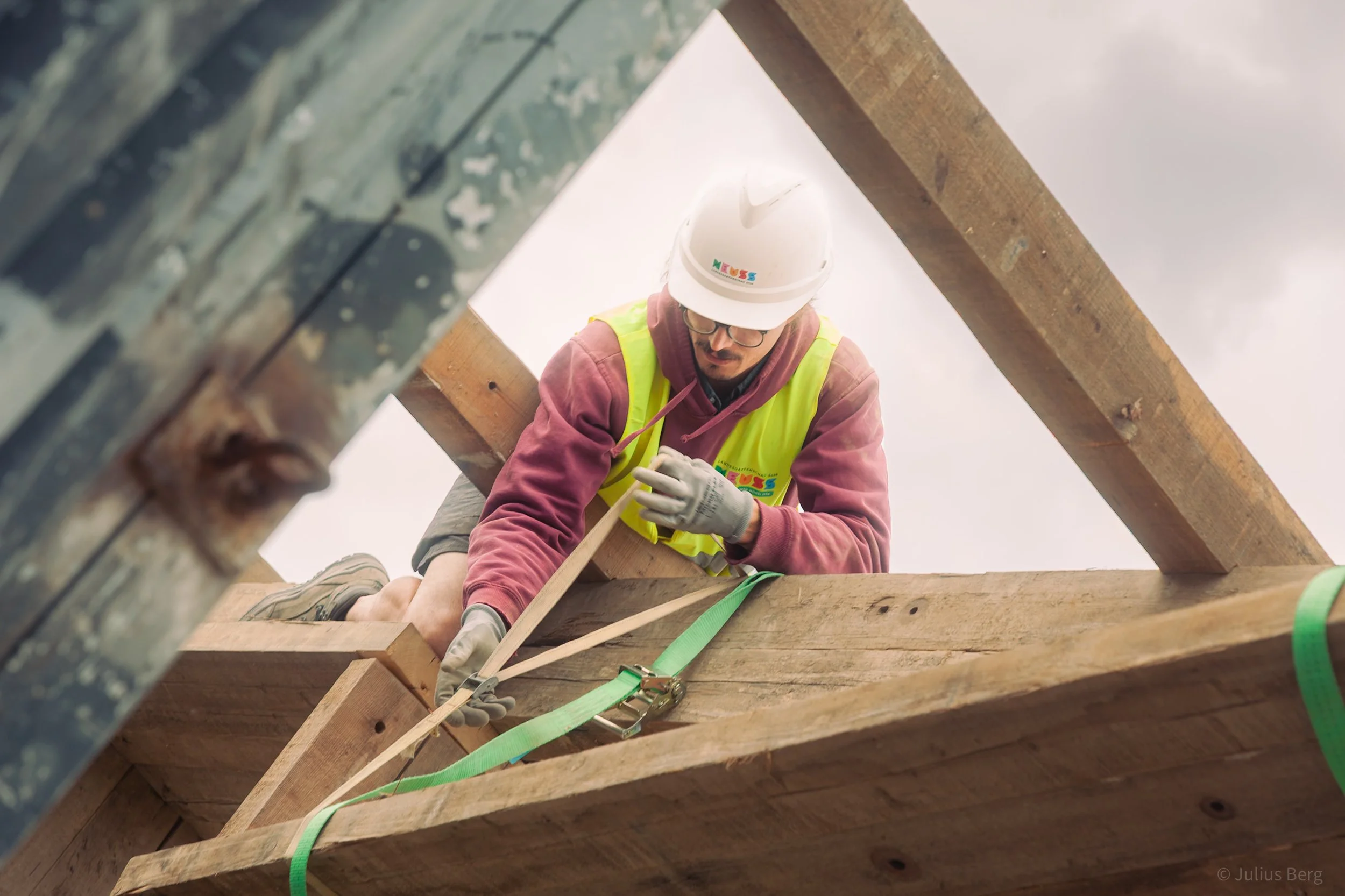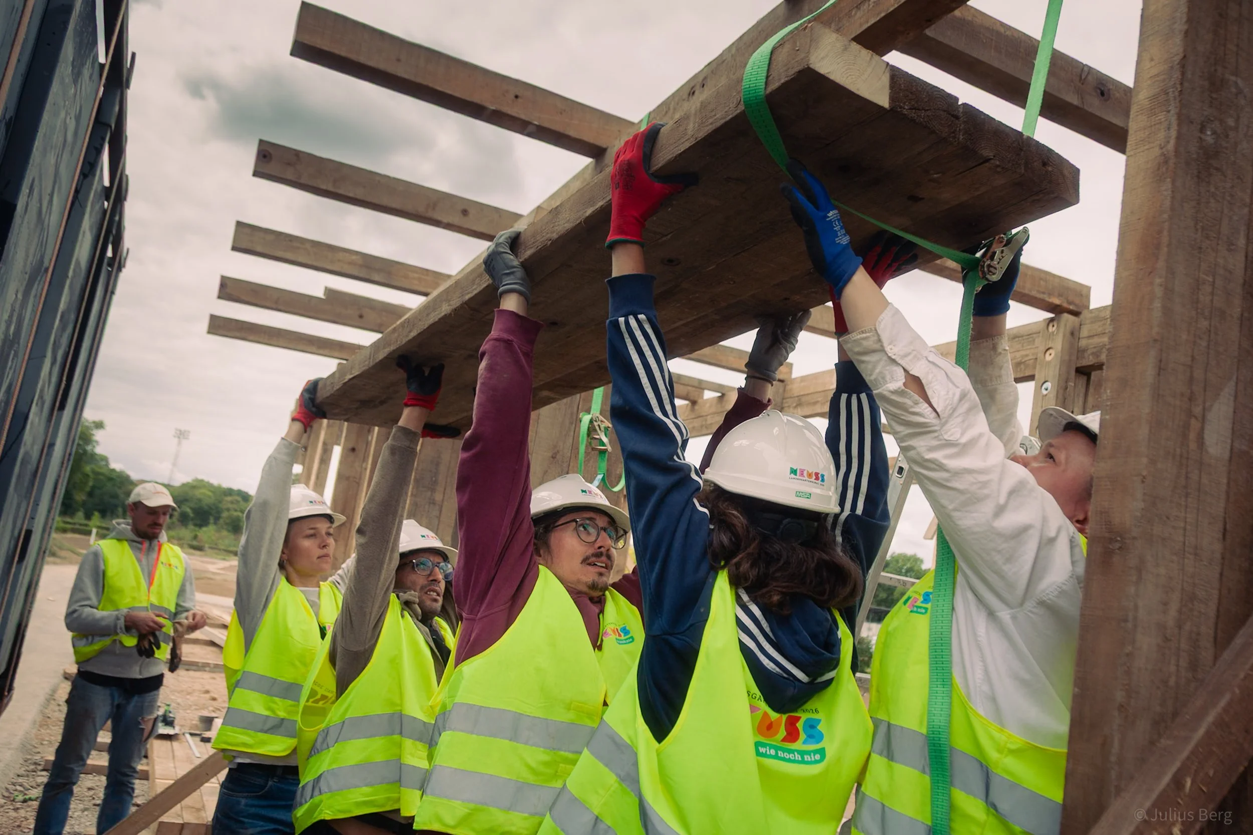 Wir haben die Fundamente eingemessen, die Wände aus wiederverwendeten Balken aufgestellt und die fast 200 Kilogramm schweren Pfetten eingebaut. Außerdem wurden alte Türen aus den Pferdeboxen des Rennbahnparks aufbereitet, die später als Öffnungselemente dienen. Unterstützt wurde der Workshop von Lignum Holzbau.